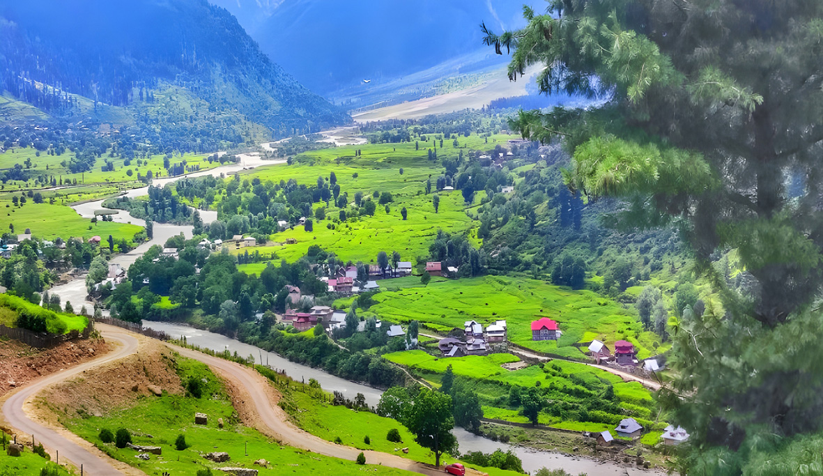 As you journey towards Marwah, you are met with beautiful views. Lush green mountains rise majestically on one side, while the Marwah and Warwan valleys reveal their deep, captivating beauty on the other. To the northwest, scattered houses dot the landscape, nestled within the vast natural greenery.