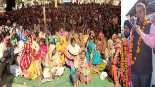 JSM MLA Ashwani Sharma addressing ‘Maha Rally’ at Bishnah on Sunday.