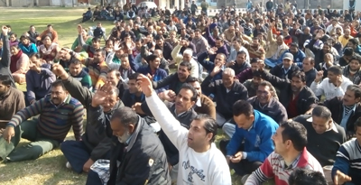 JAMMU, Dec 16: Continuing their strike against suspension of two Watchmen over the defacement of Replica Stone on campus, the Class-IV employees and Casual workers of Jammu University held a protest demonstration today.