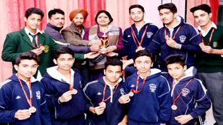 Jubilant DPS Cricket team posing along with Principal of the School after lifting title trophy at KC Sports Club in Jammu.