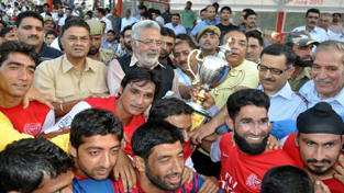 Jubilant footballers of J&K Police team posing for a photograph while receiving title trophy from Taj Mohi-ud-Din, Minister for Sports in Srinagar. By Daily Excelsior - July 1, 2013 Share FacebookTwitterWhatsAppPinterestLinkedinCopy URLTelegramEmailTumblrReddItPrintKoo Jubilant footballers of J&K Police team posing for a photograph while receiving title trophy from Taj Mohi-ud-Din, Minister for Sports in Srinagar. Follow our WhatsApp channel