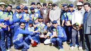 Jubilant Media XI players posing for a group photograph along with Minister for Sports, Molvi Imran Raza Ansari in Jammu on Sunday.