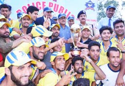 Jubilant players of BCC Bulls team posing along with chief guest and guest of honour while holding winners trophy at GGM Science College ground in Jammu on Friday.