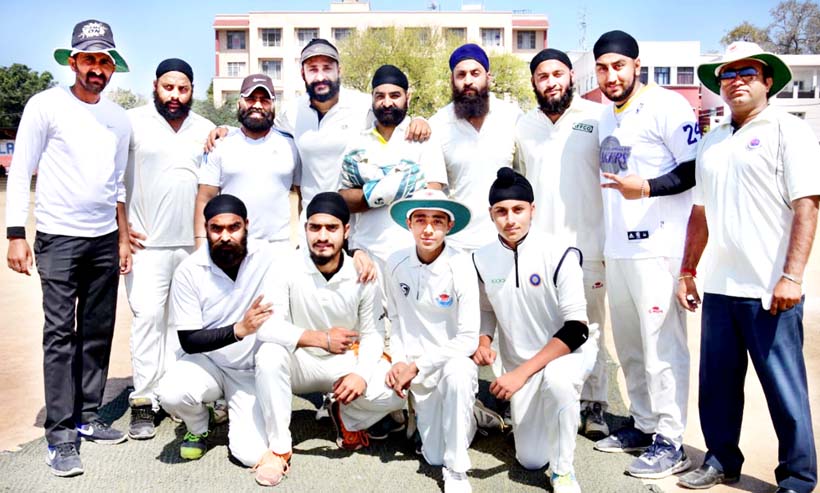Jubilant Samar Cricket Club players posing for a group photograph after registering victory to enter QFs of Winter Shield T20 Cup in Jammu.