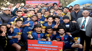 Jubilant Vijay Club team posing alongwith ADGP Dilbag Singh and other dignitaries after winning 5th Christmas Soccer Championship in Jammu. -Excelsior/Rakesh