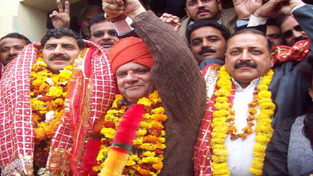 Jugal Kishore Sharma and Dr Jitendra Singh along with Ashok Khajuria waving to BJP activists at Jammu on Friday.