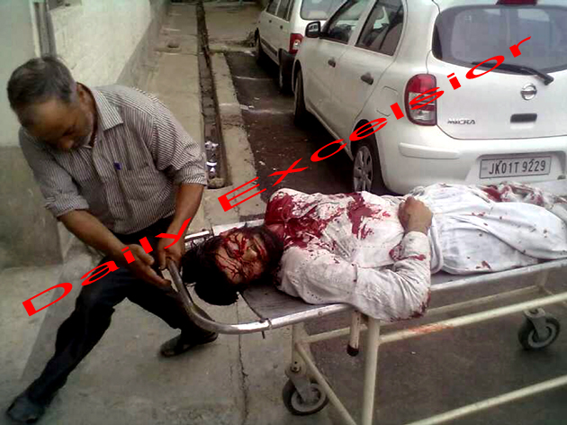 July-17, 2013-SRINAGAR:A man carries an injured at a Srinagar hospital for treatment who was injured when suspected militants through a Grenade on a police party at Batmalloo Srinagar on Wednesday. Excelsior/ Amin War