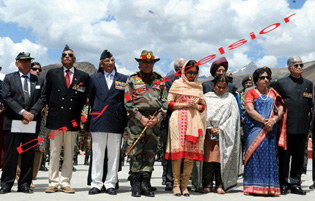July- 26, 2013-DRASS: Army Lieutenant General Officer Commanding-in-Chief, Northern Command, Lt General Sanjiv Chachra along with his wifer and senior army officers during wreath laying ceremony during ‘Vijay Diwas’ or ‘Victory Day’ 14th celebrations in Drass, about 160 kms east of Srinagar on Friday. The Indian Army commemorates ‘Vijay Diwas’ annually to celebrate the Kargil War victory and the martyrdom of more than 500 soldiers killed in 1999 during a war with Pakistan in the mountains of Kargil and Drass sectors, at the Line of Control, or a military ceasefire line, which divided Kashmir between the two South Asian nuclear rivals. Photo/ Mohd Amin War