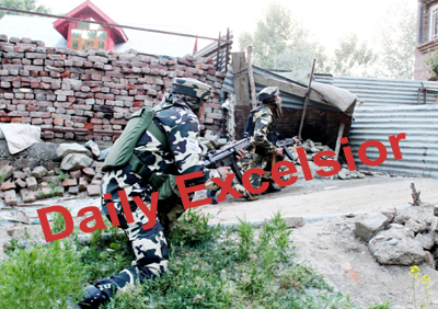 June- 08, 2014- KAKAPORA PULWAMA: Security forces personnel takes position during an encounter with militants at Reshipora Kakapora South Kashmir’s Pulwama district, on Sunday, Security forces and Special Operation Group (SOG) killed two Lashkar-e-Toiba (LeT) militants during a gunfight with militants. Excelsior / Mohd Amin War