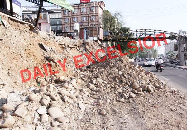 Just yards away from Jammu Municipal Corporation (JMC) office at Hari Market, debris of a razed building kept lying on road for nearly a month. —Excelsior/Rakesh