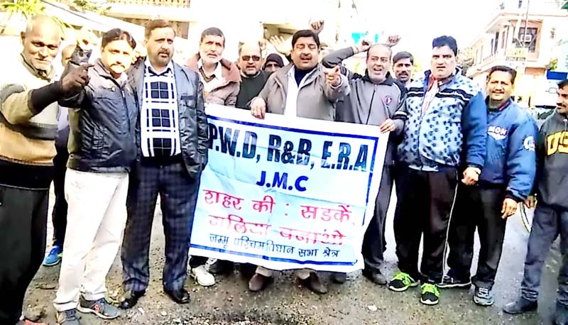 Addressing the protesters JWAM president, Sunil Dimple said substandard work was done in ERA Sewerage and other projects of JMC, PWD, R&B and PHE resulting which dirty water of drains is overflowing on roads and is getting mixed with PHE water supply. He also said that substandard work is also reflected from the condition of damaged roads.