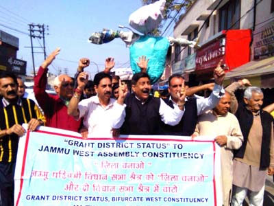JAMMU, Mar 12: Jammu West Assembly Movement (JWAM) today held a protest rally here at New Plot on Janipur-High Court road, asserting the Government to either grant district status to Jammu West constituency or bifurcate it into two Assembly constituencies.