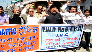 JAMMU, Apr 10: Strong protest demonstration was held today under the leadership of Sunil Dimple president Jammu West Assembly Movement against the State Government and National Highway Authority of India (NHAI) and demanded to stop the road tax on vehicles plying on Jammu-Udhampur stretch, from the people, pilgrims, tourists and on the transporters.