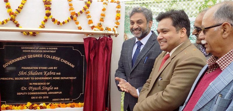 UDHAMPUR, Mar 8: Principal Secretary Home Shaleen Kabra laid the foundation stone of newly sanctioned Government Degree College at Chenani in presence of District Development Commissioner Udhampur Dr. Piyush Singla.