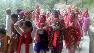 BHADERWAH, July 15: Kalash yatra was organized by Sarv Shakti Sewa Sanstha from historical temple of Maa Chandi (Paddar Wali) from village Chinote Bhaderwah.