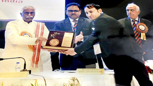 Karan Kapoor from MES Builders Association of India, Jammu Branch receiving ‘Meritorious Services to the Association Award’ from Union Minister of State (IC) of Labour and Employment Bandaru Dattatreya during 42nd Annual Day Function of the MES Builders Association of India at Air Force Auditorium, Subroto Park, New Delhi.