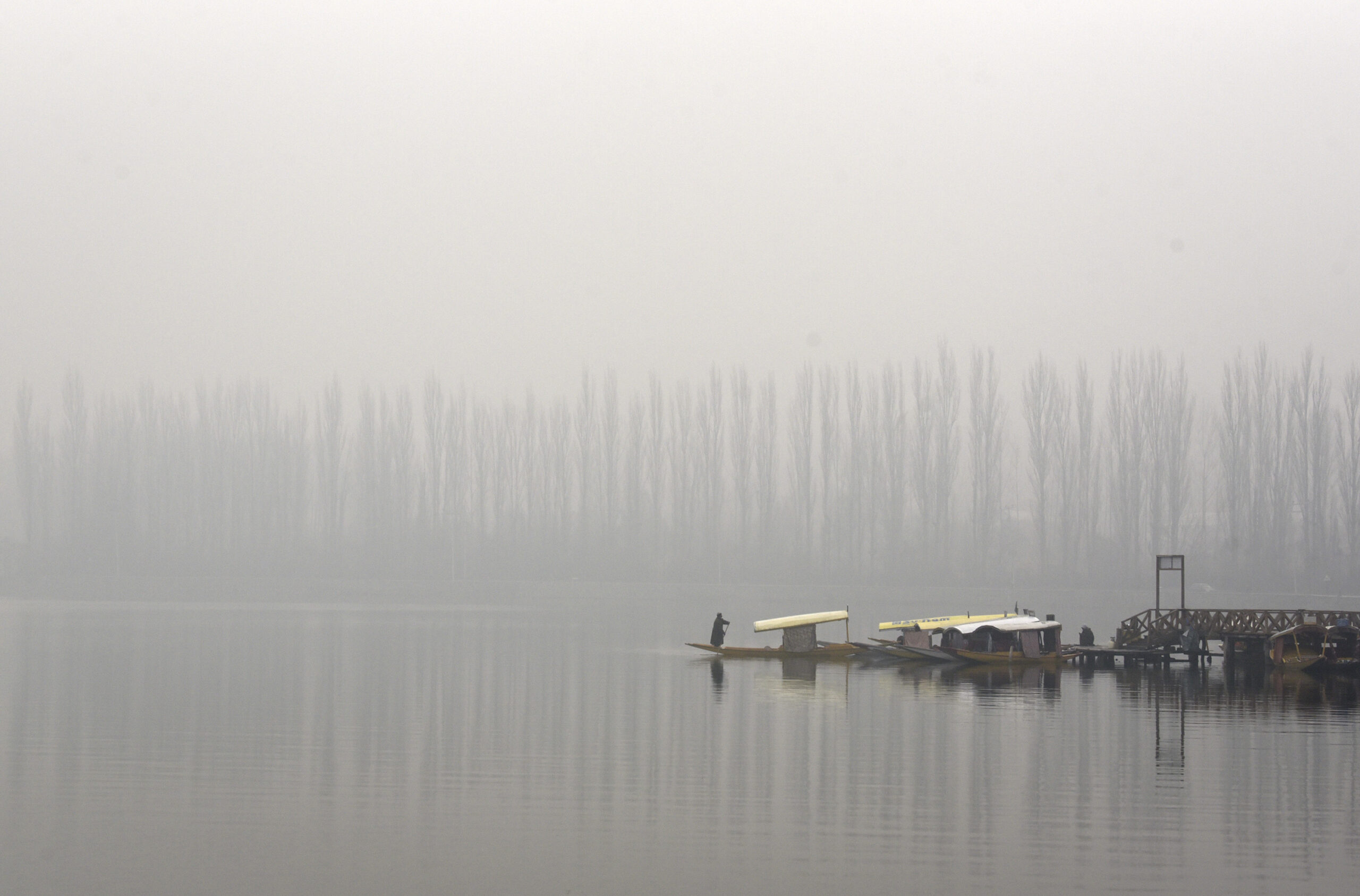 A thick layer of fog engulfed Srinagar and most other parts of the valley, especially near water bodies, during the early hours.