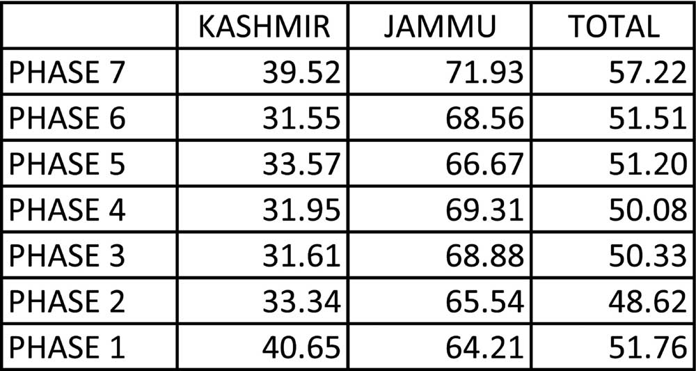 Sharma informed that in Kashmir division the polling percentage recorded in Budgam was 35.12%, Anantnag 8.66%, Kulgam 11.20%, Pulwama 8.50% and 8.58% polling was registered in Shopian.