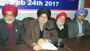 Kashmir Sikh Sangat chairman, Dhanwant Singh and president Sewa Singh, addressing a joint press conference in Jammu on Wednesday. -Excelsior/ Rakesh