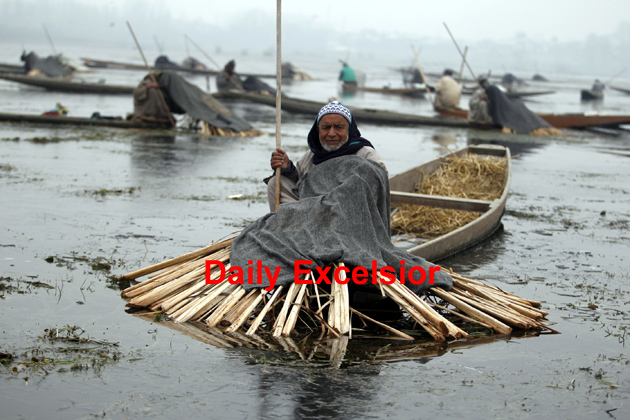 A Kashmiri fisherman cover their heads and part of their boats with blankets and straw as they wait to catch fish in the waters of the Anchar Lake on a cold winter day on the outskirts of Srinagar, on Wednesday. The fishermen use the blankets and straw to prevent light from entering through the water, which according to them helps in the catching of fish. Excelsior/Mohd Amin War