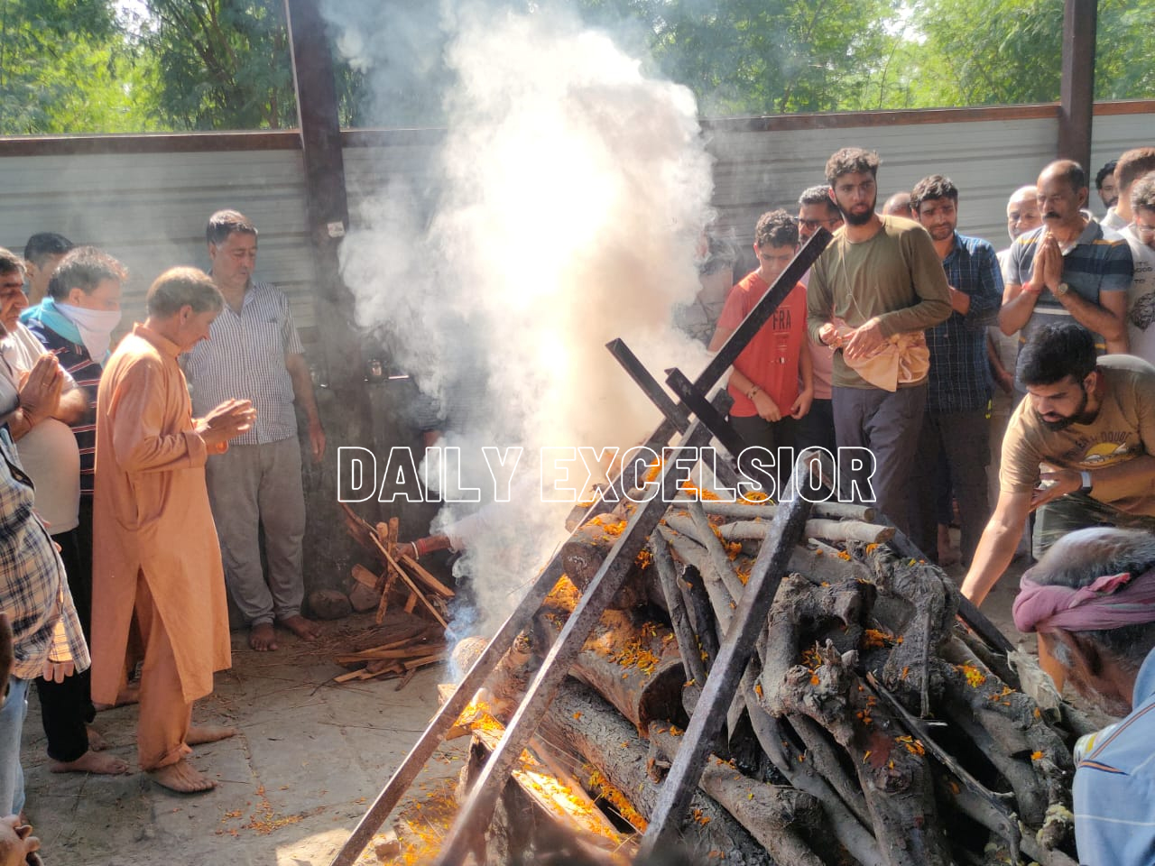 Amid chants of high-pitch sloganeering against Pakistan, thousands of mourners joined Bhat’s two children — Shriya (daughter) and Shanu (son) — and other relatives at the Ban Talab crematory Sunday to bid a tearful adieu to him.