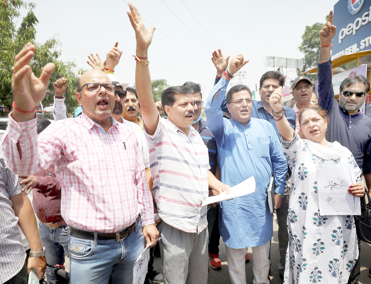 A large number of Kashmiri Pandits affiliated to BJP assembled near Press Club Jammu and raised slogans against National Conference and its chief Dr Farooq Abdullah on his statement issued yesterday on Balkrishan Ganjoo and banning of ‘Kashmir Files’ movie.