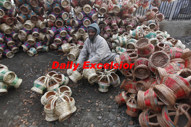 A Kashmiri vendor arranges Kangris or traditional fire-pots, as he waits for customer, in Srinagar on Wednesday. The kangris cost about Rupees 100-350 and are carried around by Kashmiris to keep themselves warm during winter. ..Excelsior/ Mohd Amin War