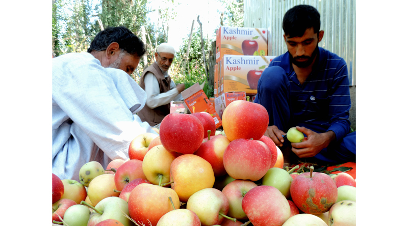 Kashmir’s golden treasure Apple harvesting begins in outskirts of Srinagar to export it to other parts of the world amid pandemic Coronavirus on Sunday. (UNI)