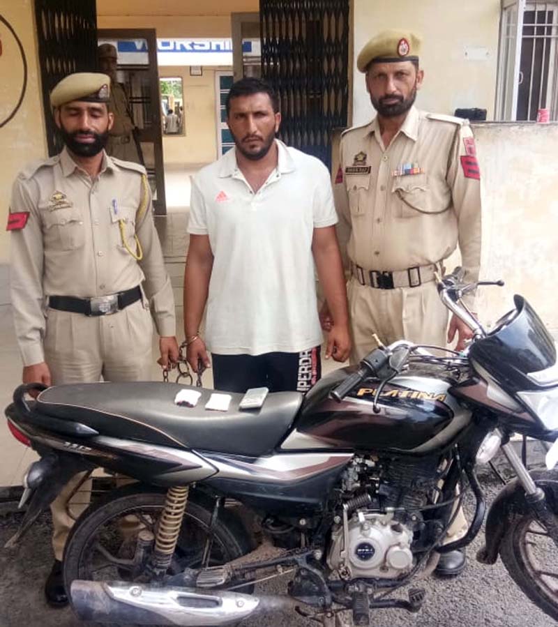 As per reports, a team of Police Station Kathua during checking duty in Changran area apprehended a drug peddler namely Shamdin @ Billu S/o Sharif Mohammad, R/o Kote Punnu Kathua and seized 10 grams of heroin from his possession. He was riding on a two wheeler without Registration Number. Police team also seized the motorcycle.