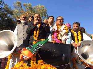KATHUA/BILLAWAR, Dec 1: Union Minister of State (Independent Charge) of the Ministry of Development of North Eastern Region (DoNER), MoS PMO, Personnel, Public Grievances & Pensions, Atomic Energy and Space, Dr. Jitendra Singh received a rousing welcome on his arrival, first at Kathua and later at Billawar, where the Bharatiya Janata Party (BJP) candidates, Rajiv Jasrotia and Dr Nirmal Singh filed their nomination papers today for the two Assembly constituencies respectively.