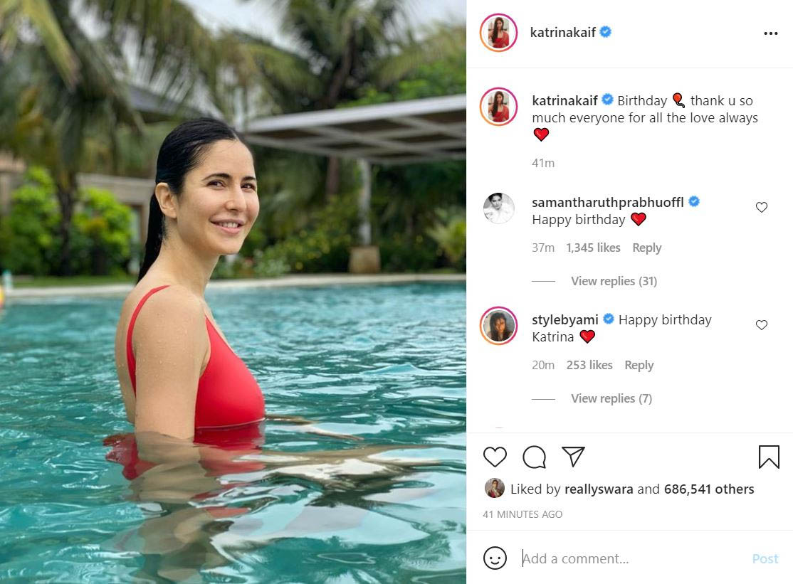 Sharing a picture of her dressed in red swimwear on her Instagram handle, Katrina wrote, “Birthday. thank u so much everyone for all the love always.”