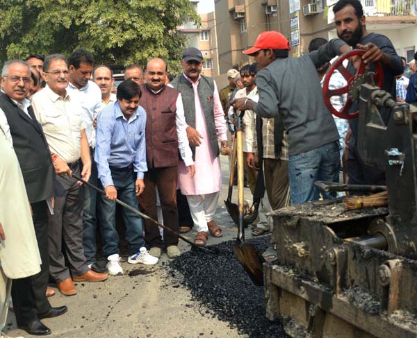 Speaker Legislative Assembly Kavinder Gupta kick starting blacktopping work at Shastri Nagar on Wednesday.