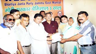 JAMMU, June 13: Jammu East MLA and BJP chief whip, Rajesh Gupta organised a programme at Rajput Sabha Purani Mandi here, today on the eve of Modi Sarkar Bemisaal 3 Saal. In this programme relief cheques were given to the rain and flash flood victims. Overall 135 families are beneficiaries and 28 lakh rupees were distributed among them.