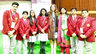 KC Public School students posing for group photograph with Katie Di Feliciantonio, Digital Communications Manager at Round Square HQ in UK during Round Square Global Conference at Welham School Dehradun.