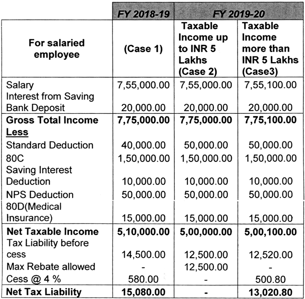 In the given table, case 1& case 2 salary income of assessee is same i.e. INR 7,55,000for the financial year 2018-2019 as well as 2019-2020,in FY 18-19 the tax outgo is INR 15,080, whereas in FY 2019-20 due to rebate under section 87Aof INR 12,500.00 there is NIL tax on entire income after claiming all deductions under income tax.This is big relief for tax payers from financial year 2019-20 having taxable incomeup to INR 5,00,000.