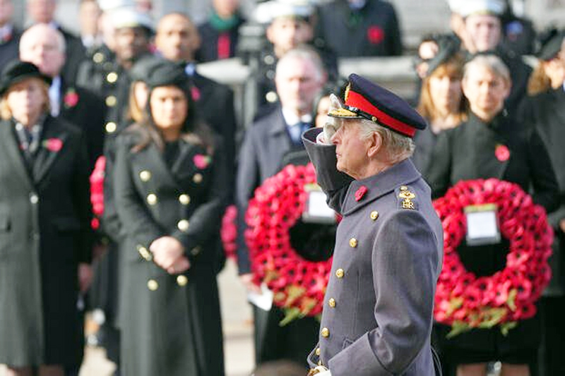 The 76-year-old king, dressed in the uniform of an army field marshal, laid a wreath of red paper poppies on a black background at the base of the Cenotaph war memorial near Parliament. Erected over a century ago to honour the British and allied troops killed in World War I, it has become the focus of annual ceremonies for members of military and civilian services killed in that war and subsequent conflicts.