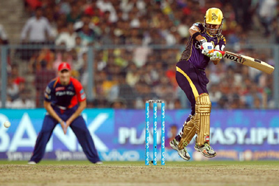 Gautam Gambhir hops up as he flicks one to the leg side in an IPL match against Delhi Daredevils at Kolkata on Sunday.