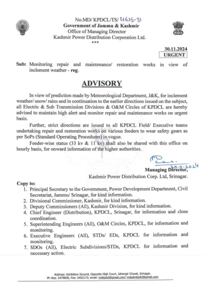 SRINAGAR, Nov 30: The Kashmir Power Distribution Corporation Limited (KPDCL) has issued strict instructions to its Electric and Sub-Transmission Divisions and O&M Circles to stay on high alert following weather forecasts of snow, rain, and inclement conditions in Jammu and Kashmir.