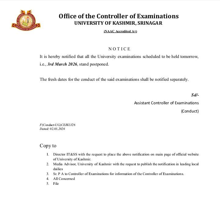 A notification issued by Office of the Controller of Examinations, University of Kashmir reads, “It is hereby notified that all the University examinations scheduled to be held tomorrow, i.e., 3rd March 2026, stand postponed”.