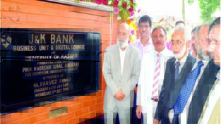 KU VC, Prof Khurshid Iqbal Andrabi along with J&K Bank Chairman and CEO Parvez Ahmed and others during foundation stone laying ceremony of bank owned BU within varsity campus.