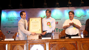 KU VC Prof Talat Ahmed receiving Tak Zaingiri award at Srinagar on Monday.