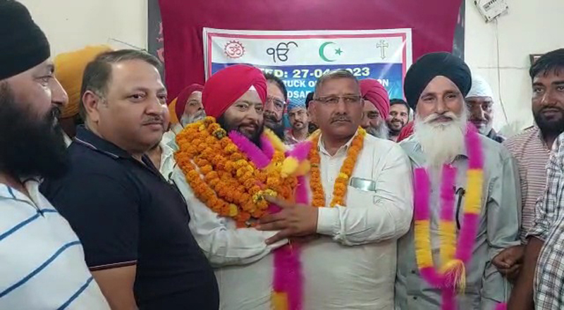 The members of Kathua Truck Operators Union garlanding Kuldeep Singh after his election as president of the Union on Thursday. -Excelsior/Pardeep