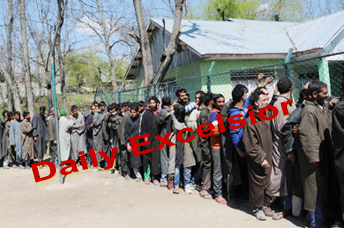 KULGAM:  Villagers  voters queue to cast their vote at a polling station during the 6th phase of LoK Sabha election at a polling station in Yaroo (D.H. Pora) village south Kashmir’s Kulgam district, on Thursday. photo/Mohd Amin War