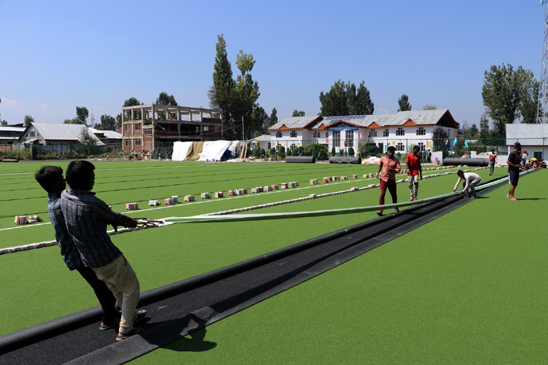 Labourers working at upcoming Synthetic Hockey Turf Stadium at Pulwama. – Excelsior/Younis Khaliq