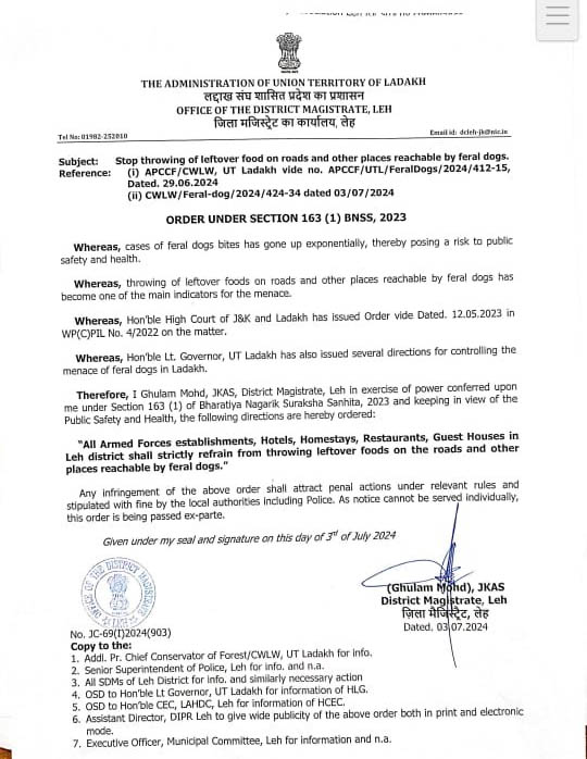 Ladakh Admin Bans Discarding Leftover Food Accessible To Feral Dogs By Daily Excelsior - July 3, 2024 Share FacebookTwitterWhatsAppPinterestLinkedinCopy URLTelegramEmailTumblrReddItPrintKoo Leh, July 3: Amid rising dog bite cases, the Union Territory Government of Ladakh has banned the discarding of leftover food on roads and streets accessible to feral dogs. Follow our WhatsApp channel