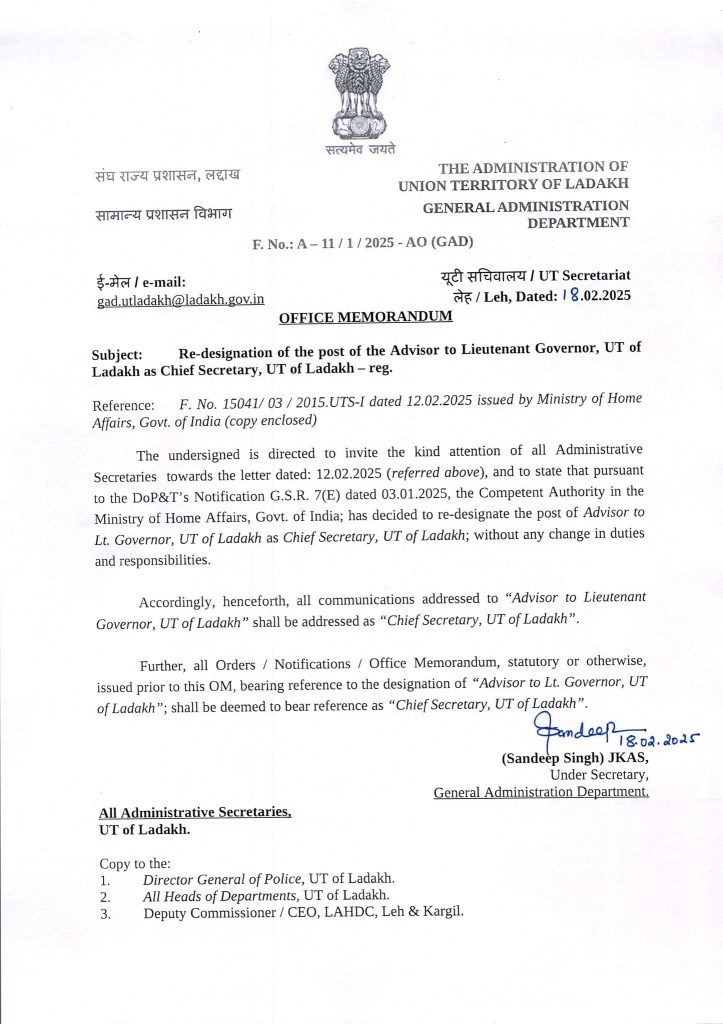 JAMMU, Feb 18: The Ladakh Admin has re-designated the post of Advisor to LG as Chief Secretary.