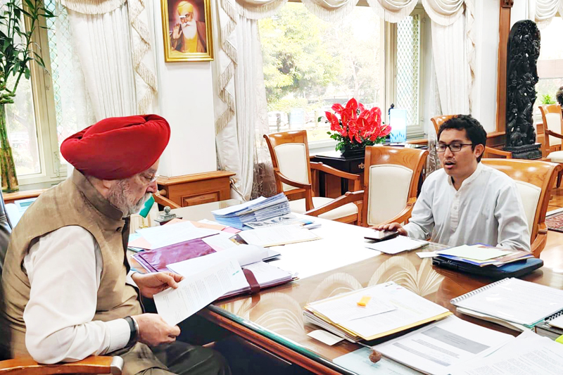 LEH, Nov 19: MP Ladakh, Jamyang Tsering Namgyal today called on Minister of Civil Aviation, GoI, Hardeep S Puri at New Delhi to apprise him of the serious issues pertaining to air fares and Airlines services in Ladakh.