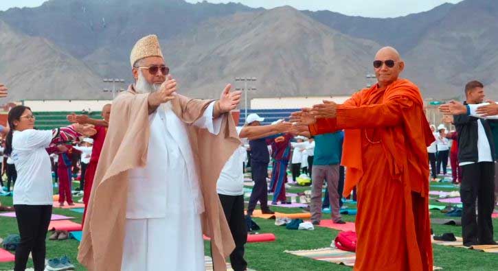 Leh, June 21: Multi-faith leaders participated in the 10th UN International Day of Yoga in Leh, Ladakh, under the banner of the Indian Minorities Foundation and praised Prime Minister Narendra Modi for his initiative to take yoga to the world and make it a global phenomenon.