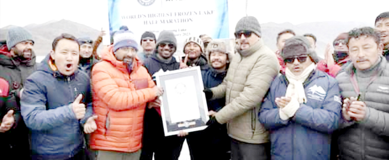 LEH, Feb 21: The exotic Pangong Frozen Lake Marathon is officially registered in the Guinness Book of World Records as the World’s Highest Frozen Lake Half Marathon, setting a new achievement for UT Ladakh.