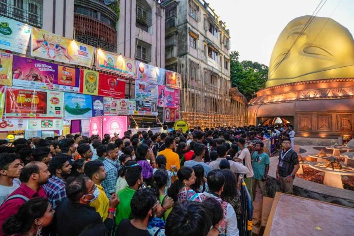 KOLKATA, Oct 21 : Lakhs of people descended on the streets on ‘Maha Saptami’ to see beautiful idols of Goddess Durga and her children and the exquisite artwork in different pandals on Saturday.